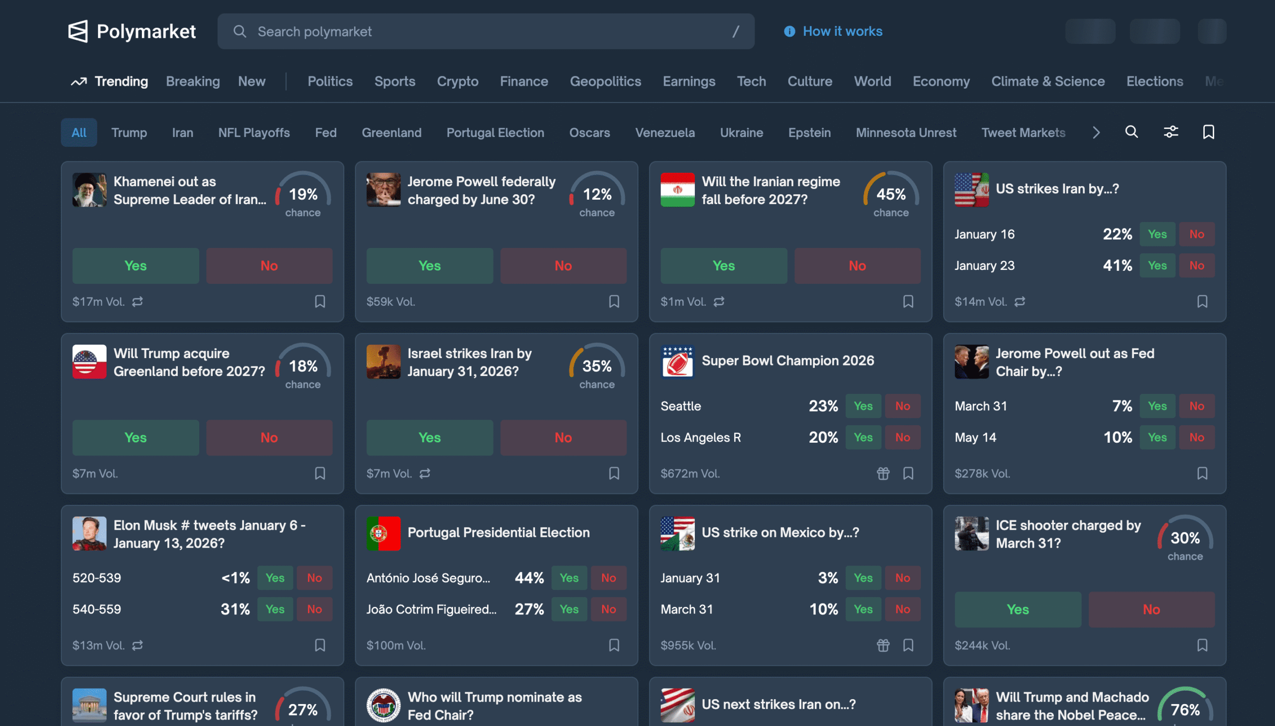 PolyMarketは、「2026年のアメリカ大統領は誰か?」といった政治・経済から、「今夜のスポーツの試合結果は?」といった身近な話題まで、あらゆる未来の出来事の結果を予測し、賭けることができる世界最大の予測市場プラットフォームです。