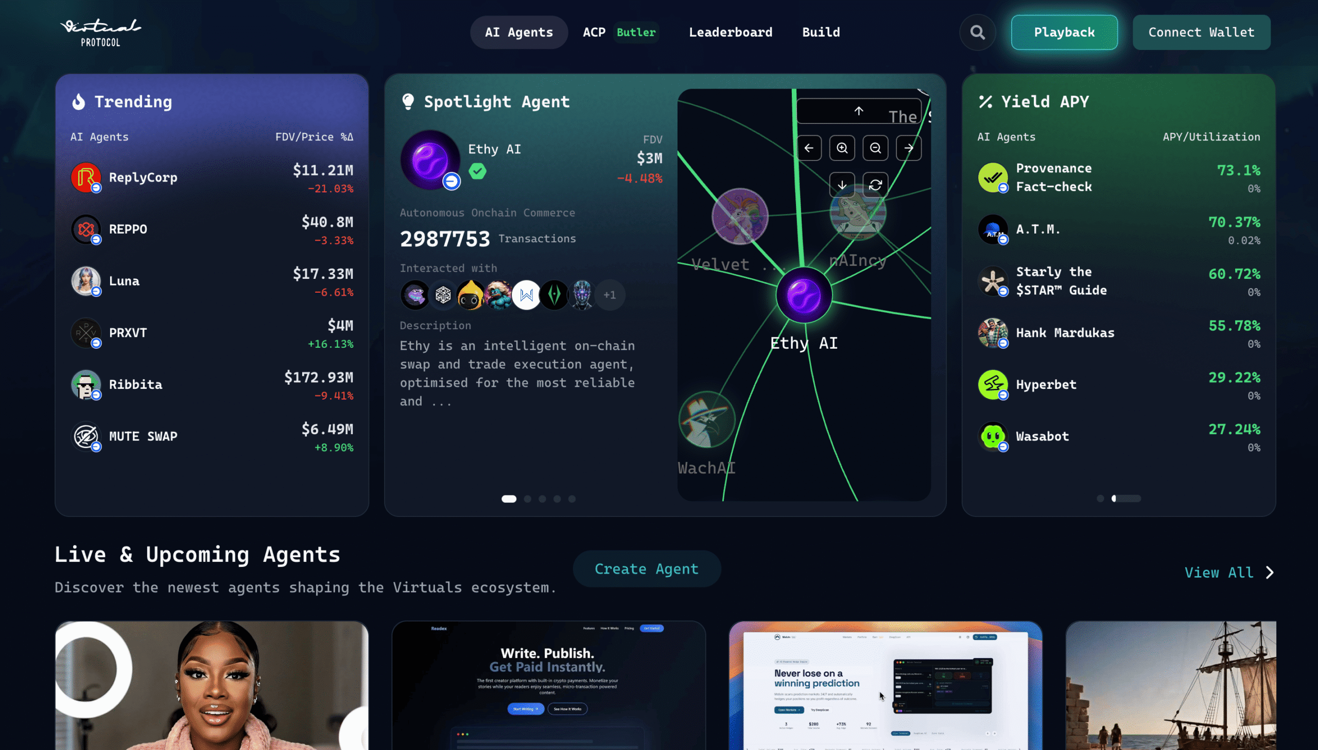 Virtuals Protocolは、自律的に動作するAIエージェントをブロックチェーン上で作成、所有、取引、収益化することを可能にする分散型プロトコルです。