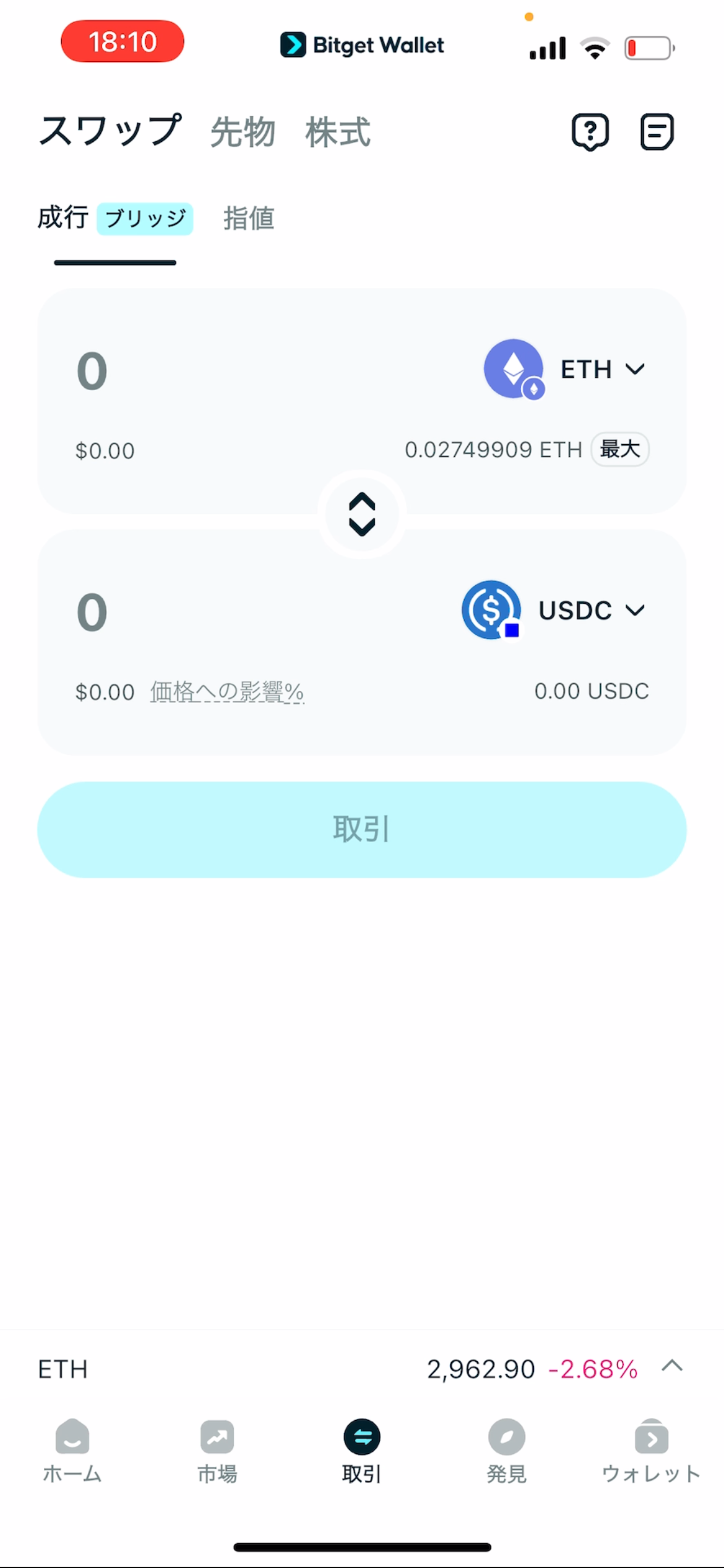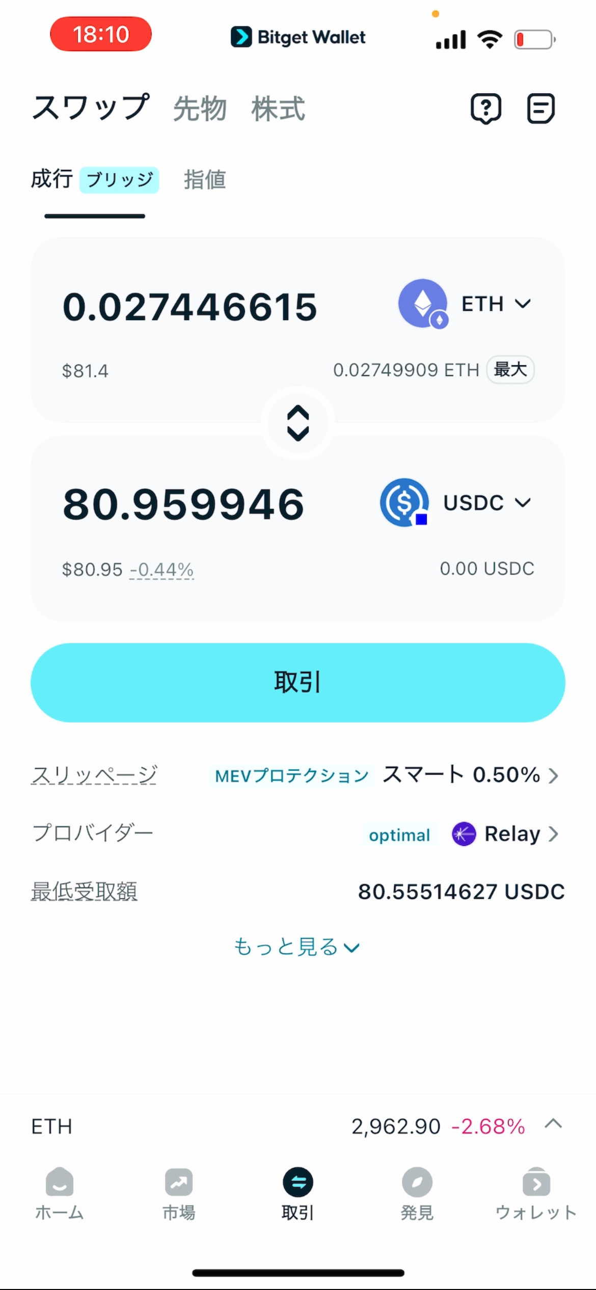 国内取引所から送金したETHを、「取引」の「スワップ」から、上にETH(ETHチェーン)・下にUSDC(Baseチェーン)を選択し全てスワップします(画像2-4枚目)