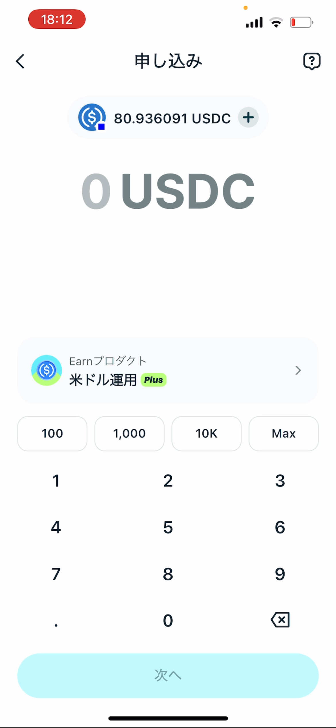 「ホーム」に戻り、「人気のEarnプロダクト」から、1番左の”米ドル運用Plus 10% APY”をタップしてください。