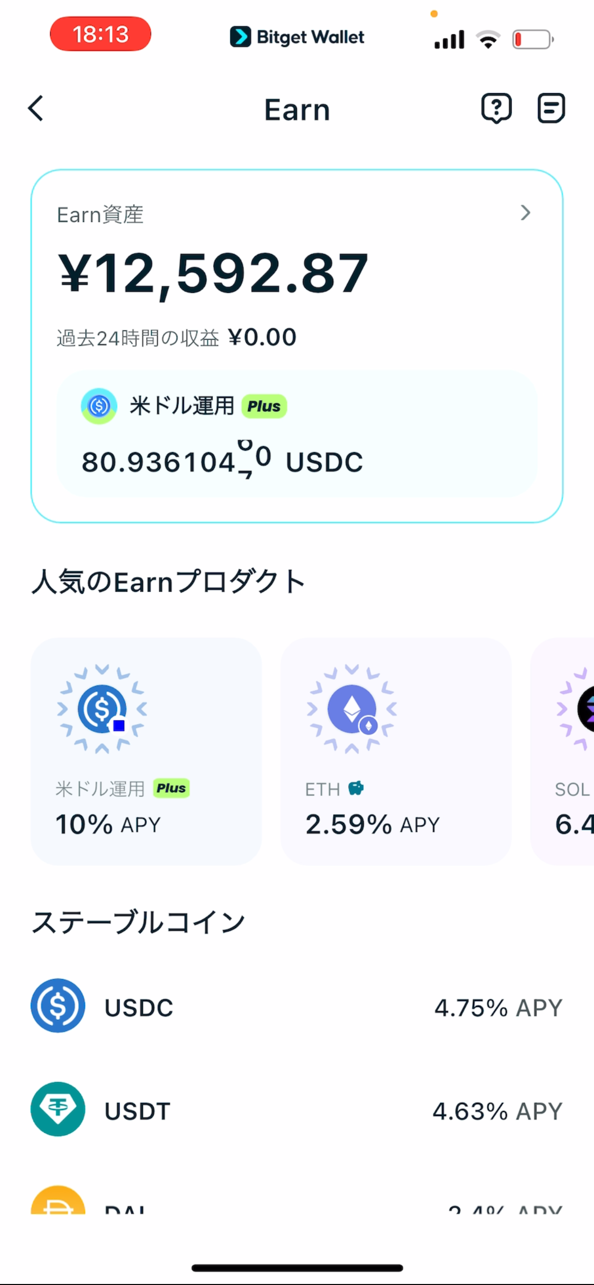 Bitget Walletの大きな魅力の一つが、アプリ内で完結する簡単な資産運用機能「Earn」です。