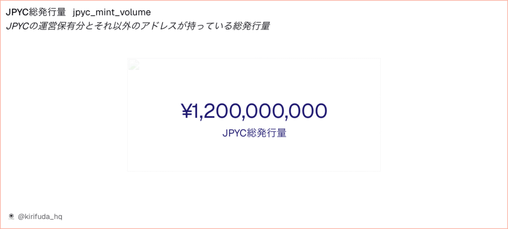 キリフダ株式会社が作成したDune上の「JPYCダッシュボード」は非常に見やすく、知りたい内容がまとまっています!JPYCのオンチェーン情報を知りたい際にはこちらがおすすめです!