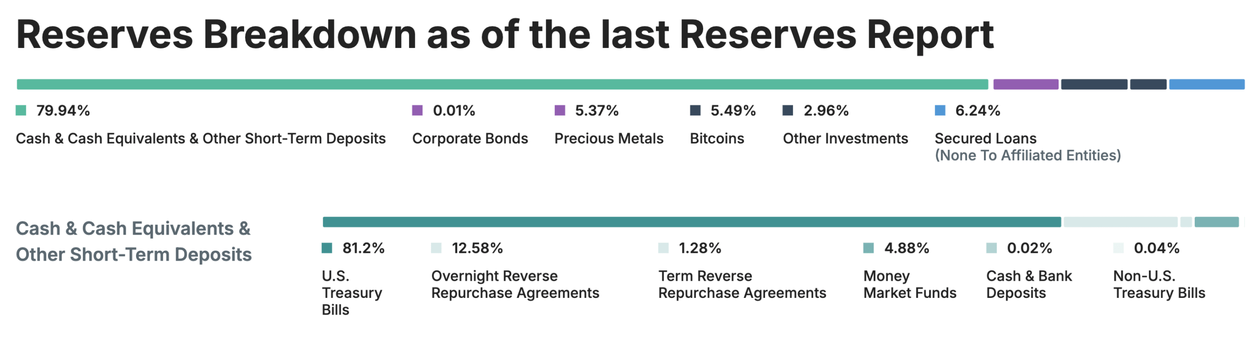 例えばUSDTを発行するテザー社の場合は、「こちらのページ」で閲覧することができます。実はテザー社は預かり金額の5.49%をビットコイン(BTC)にしている、ということも知ることができます。