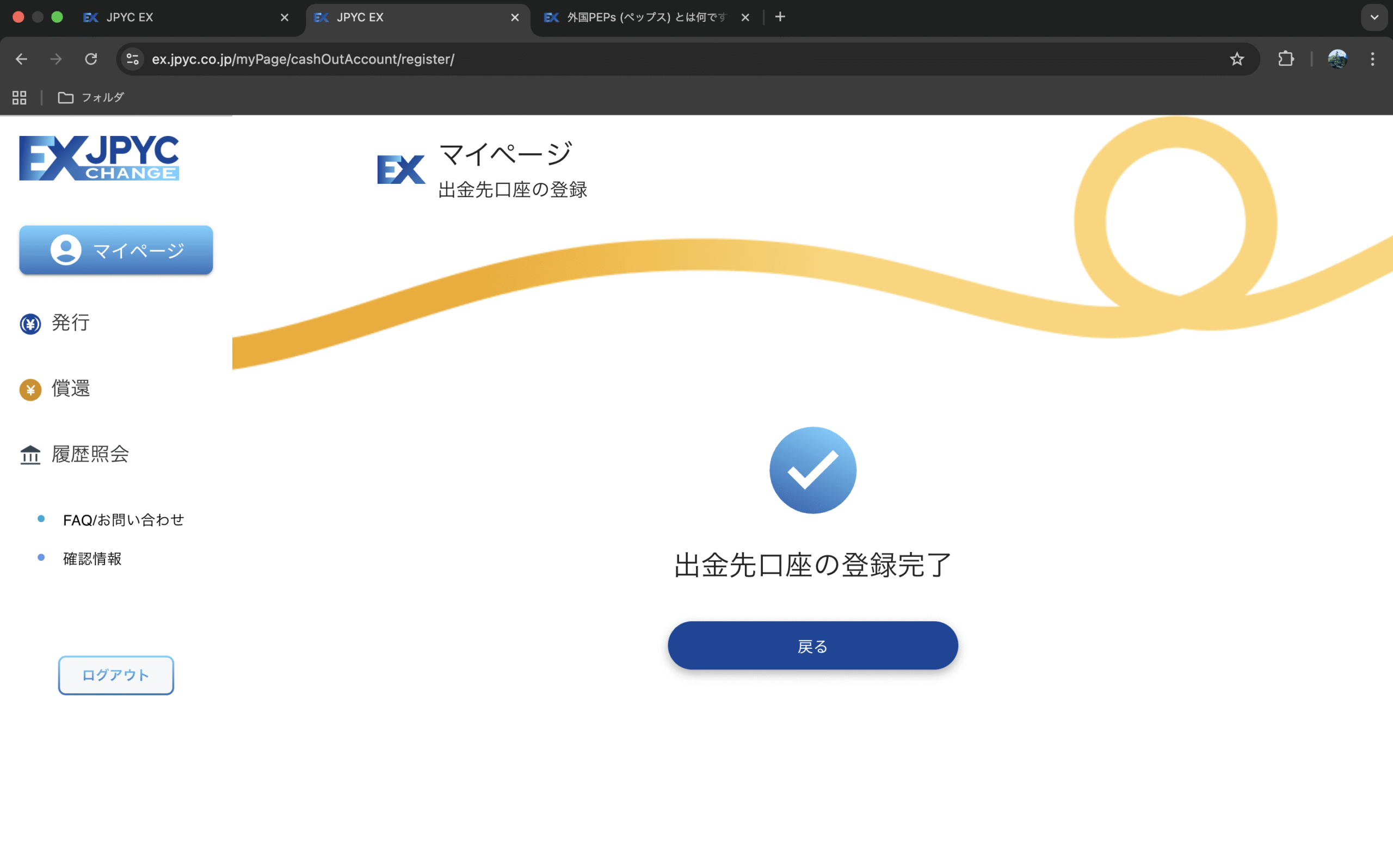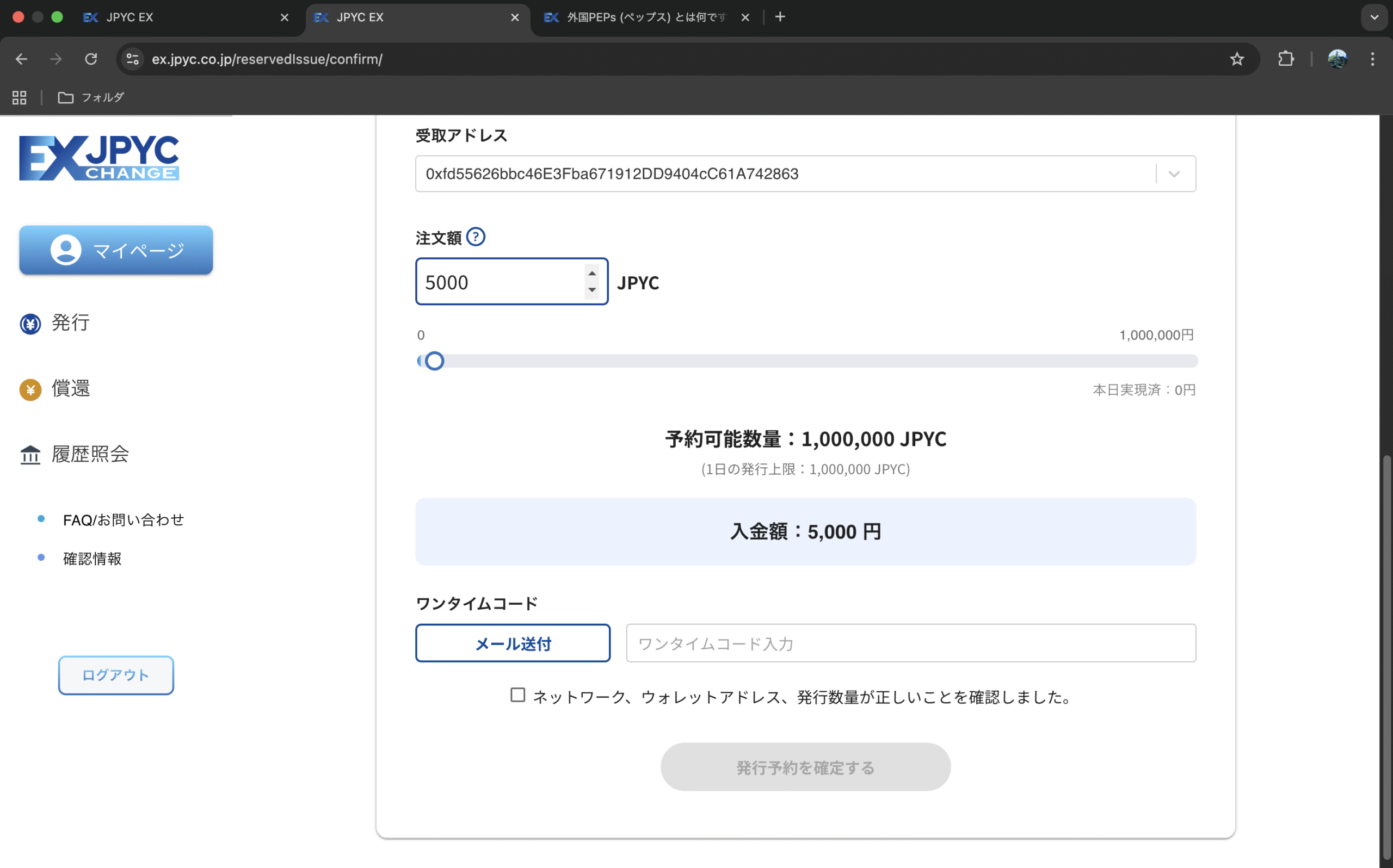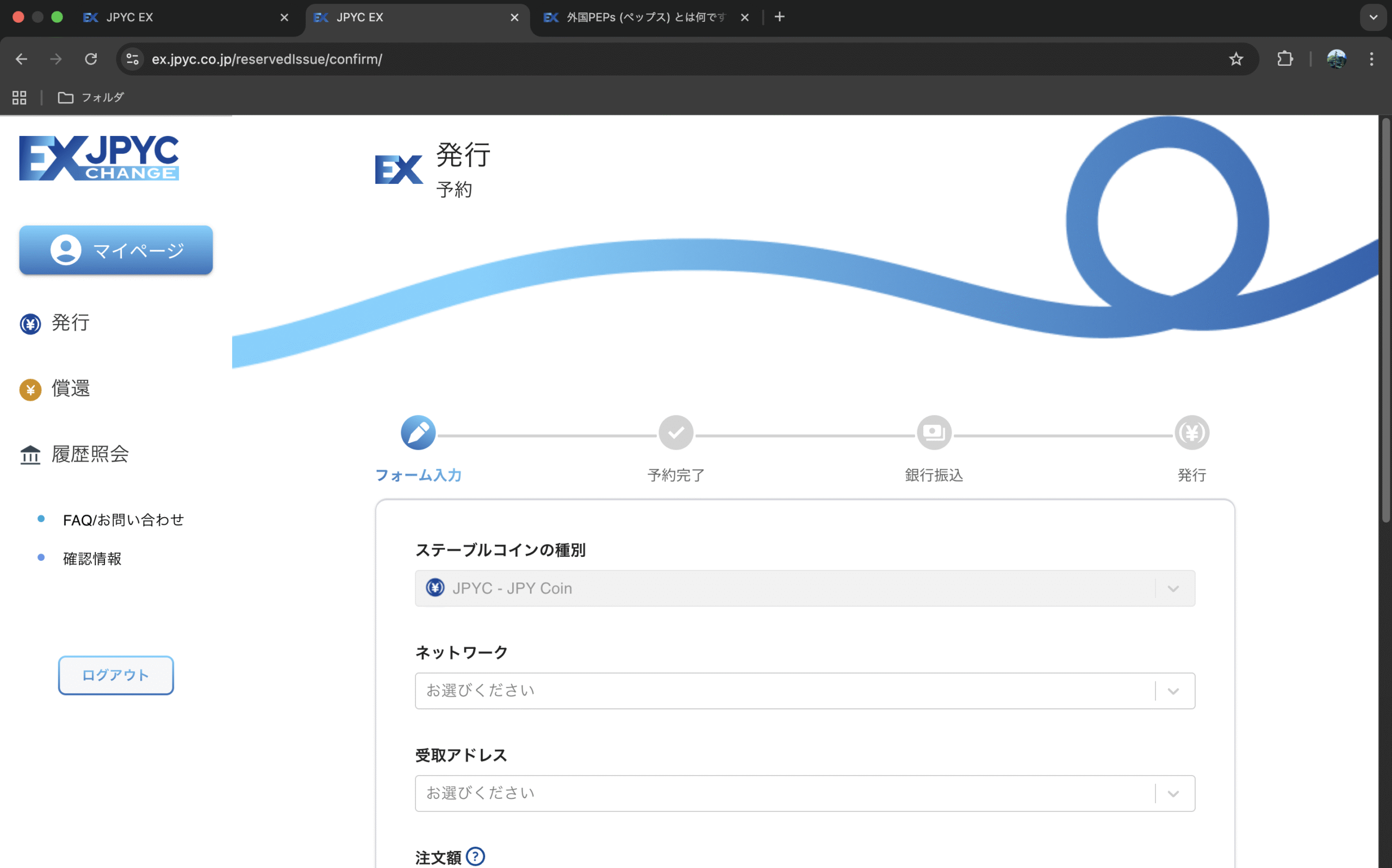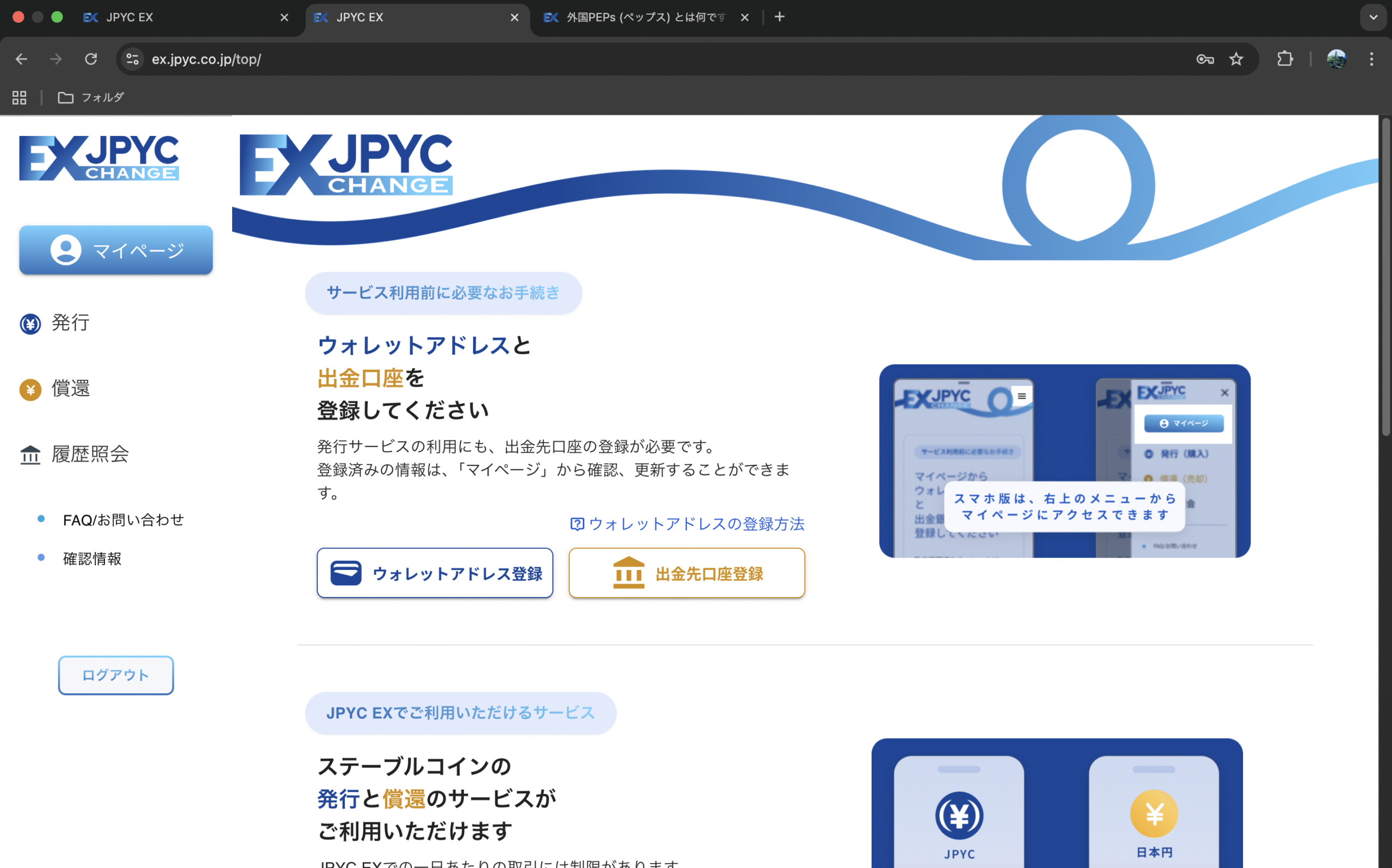 JPYC EXは、JPYCの「発行(日本円からJPYCへの交換)」と「償還(JPYCから日本円への払戻し)」を行うための公式プラットフォームです。
