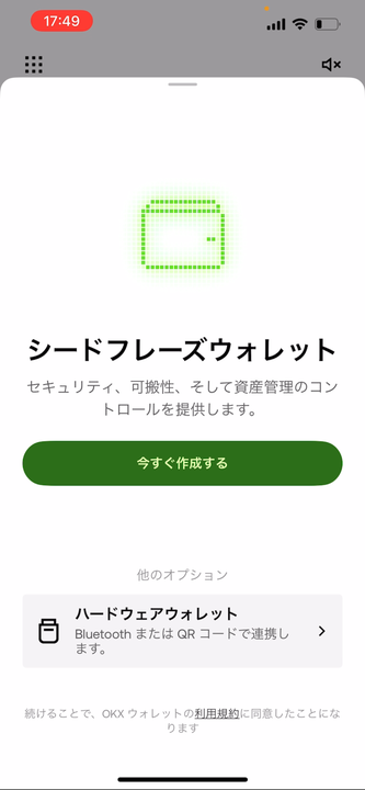“シードフレーズウォレット”の画面が出たら「今すぐ作成する」をタップしてください(画像2)。