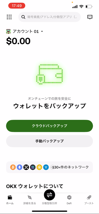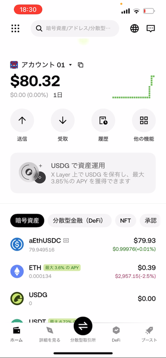 OKX Walletは、DeFi機能以外にも豊富な機能を備えています。アプリ下部の主要な5つのメニューについて解説します。