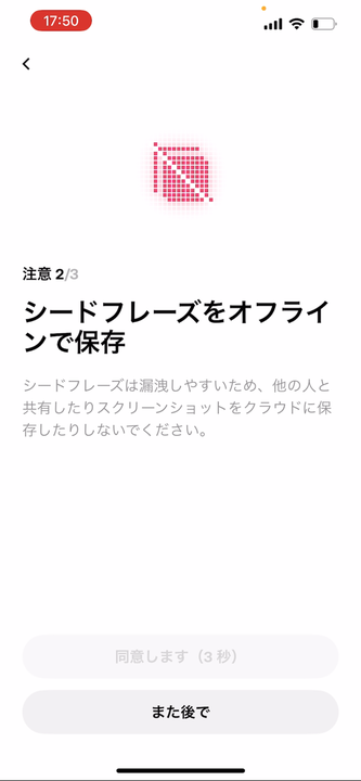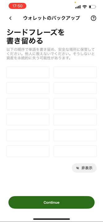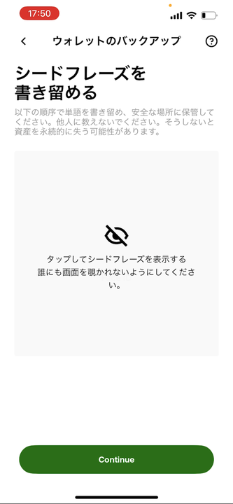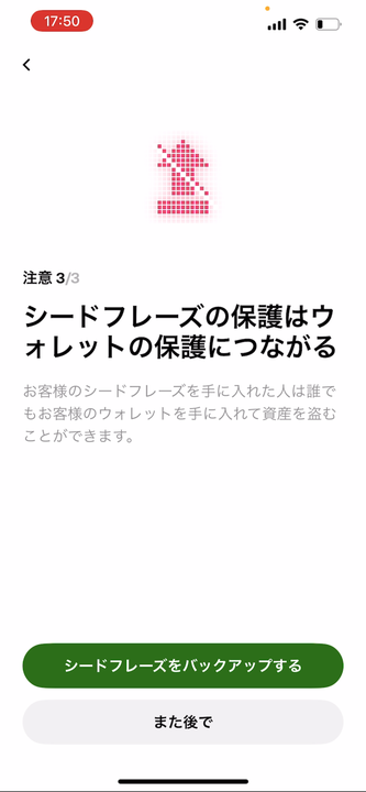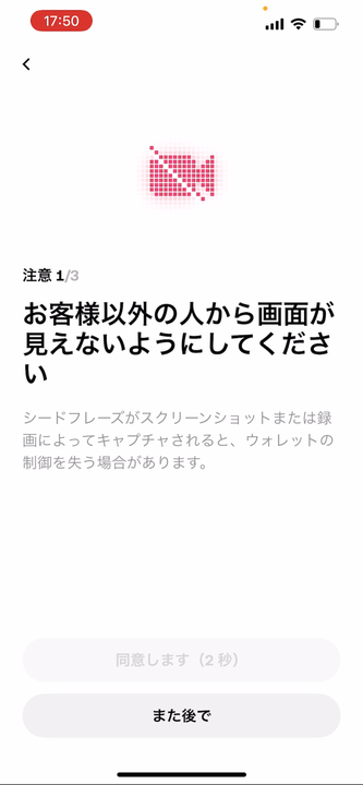 今回は説明の便宜上、8枚目で少しだけシードフレーズのヒントに近いものを見せていますが、通常は絶対に誰にも見せないようにしてください!(この説明用に作成したウォレットは破棄しています)