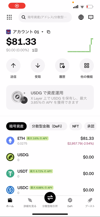 OKX WalletではステーブルコインからETHやSOLの運用ができるだけでなく、保有しているだけで利息が得られるものなど様々な方法があります。