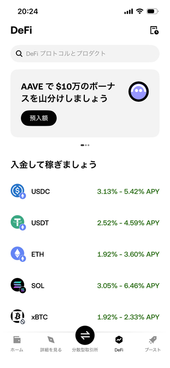 通常、DeFiで資産運用を行うには、PCで各プロトコルのサイトに個別にアクセスし、ウォレットを接続するといった手間が必要でした。しかし、OKX Walletを使えば、アプリ内から直接、AaveやCompoundといった主要なDeFiプロトコルにアクセスし、資産を預け入れることが可能です。