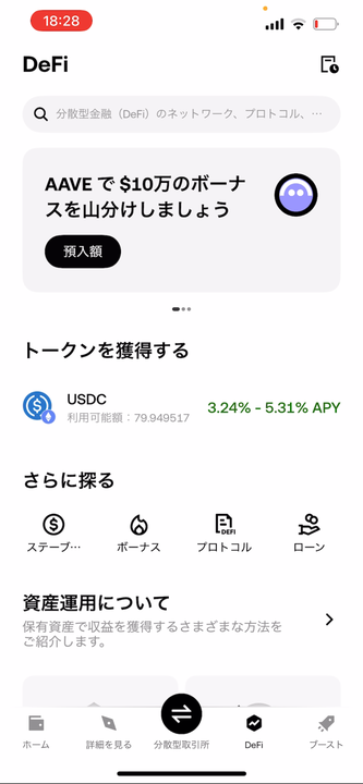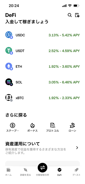 アプリの登録が完了したら、「DeFi」の機能を利用してステーブルコイン等々を運用してみましょう!