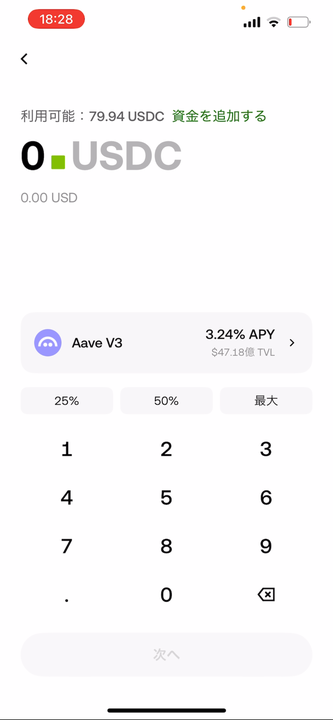 今回は、最も安定しているAave上でUSDCを運用してみます。