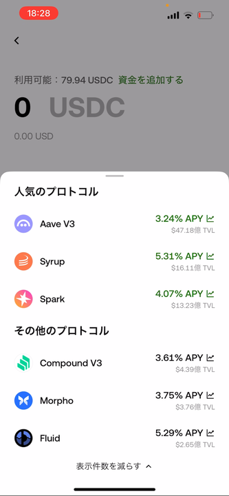 2枚目の画像における「Aave V3」のところをタップすると、様々なDeFiが提案されます(画像3枚目)。