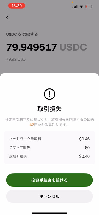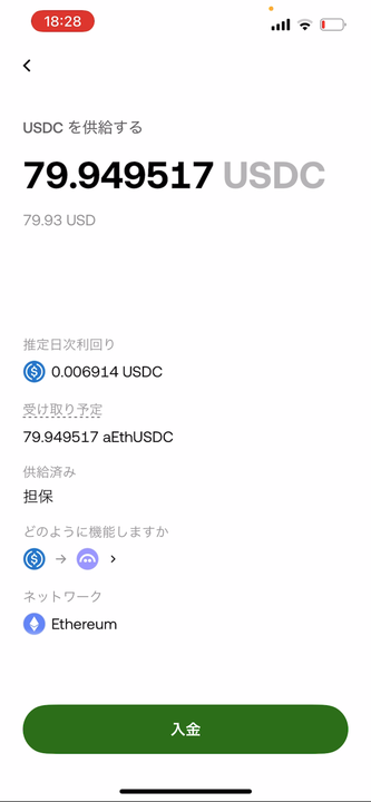 運用先のDeFiプロトコルを選択したら、運用する額を入力し「入金」等々をタップします。