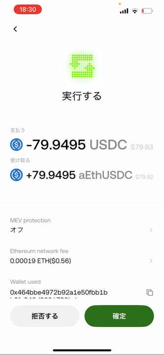 今回はAaveで運用しているので、ウォレットに「aEthUSDC」がちゃんと増えています。