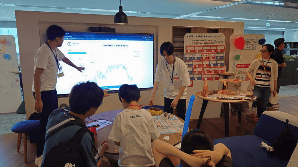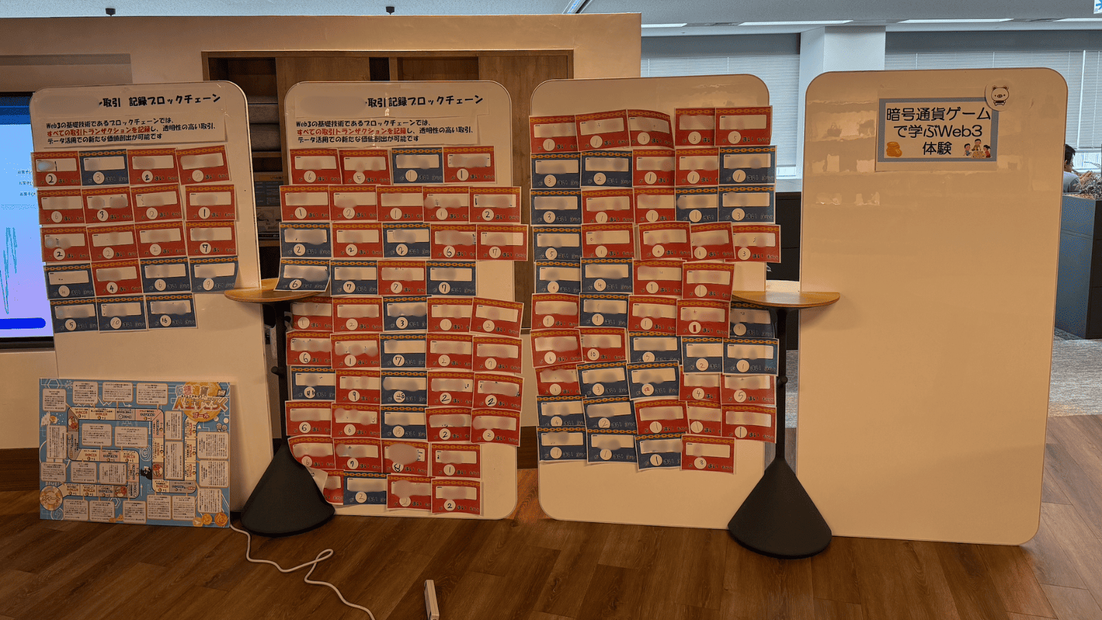 WEB3体験ブースでは、「仮想通貨人生すごろく」「オリジナルコインレート変動」「ブロックチェーンペーパー」の3つを行い、多くのご家族に気軽にWEB3を体験していただきました。